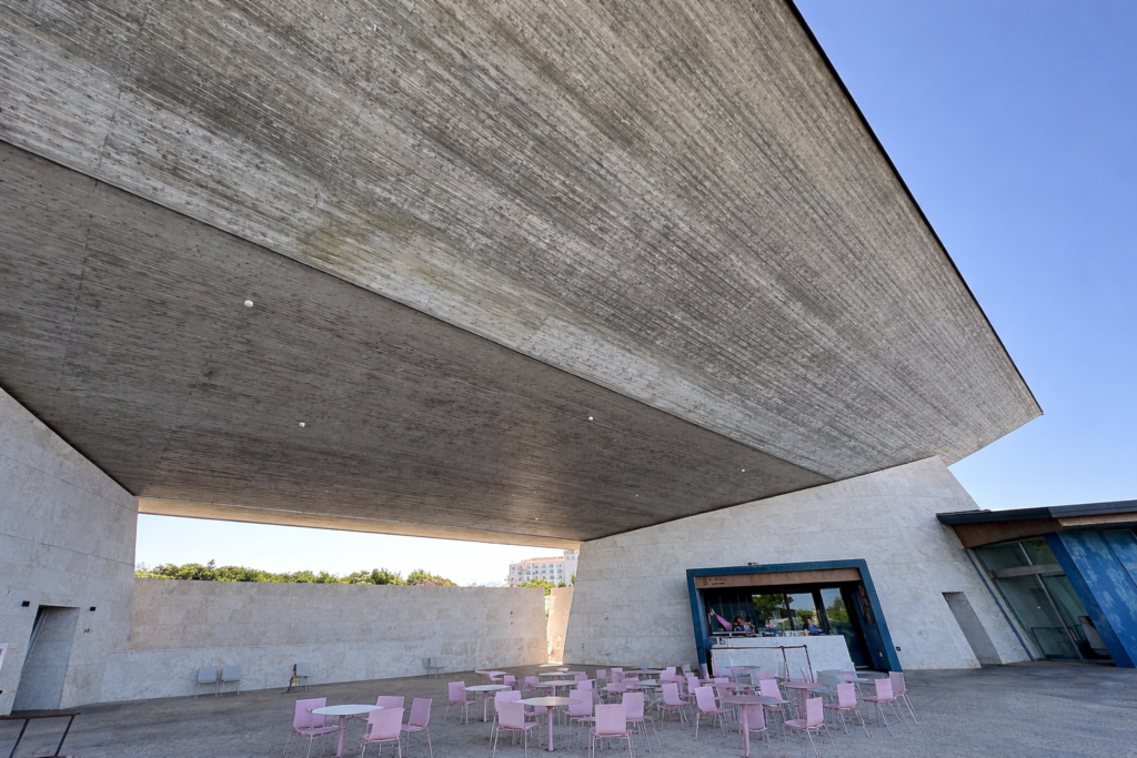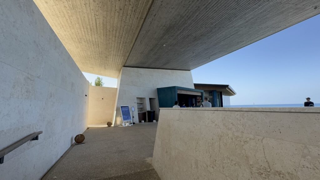 エントランスにそびえる高い壁を抜けた瞬間、視界は劇的に開けました。目に飛び込んでくるのは、果てしなく続くコバルトブルーの海と、どこまでも高い空。外界の喧騒から完全に切り離されたようなスケール感に、思わず足をとめました。広大な敷地内には、自然の地形をそのまま生かしたいくつかのエリアが点在していますが、私たちが選んだのは、より海に近いデッキスペースです。波の音が間近に迫るその席に腰を下ろすと、まるで海に浮かぶ船の特等席にいるかのような、不思議な安堵感に包まれます。