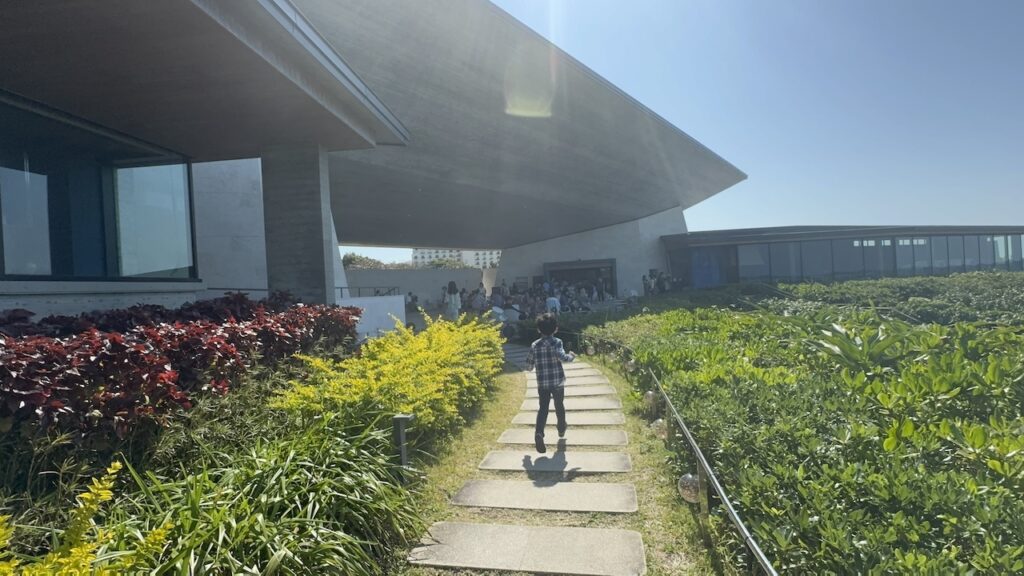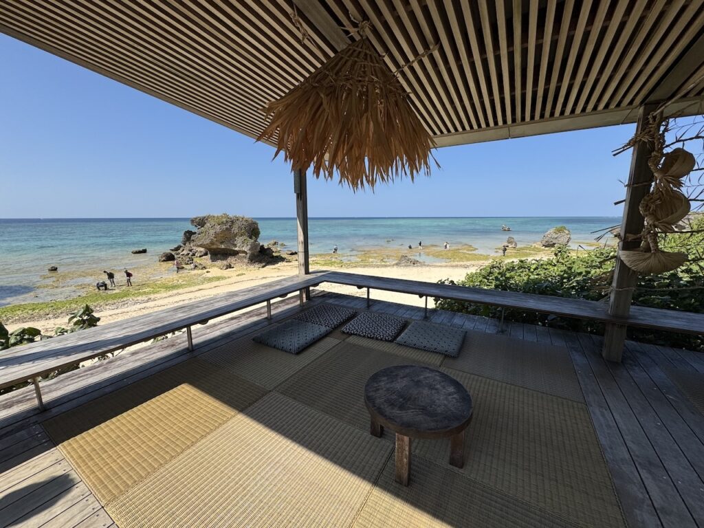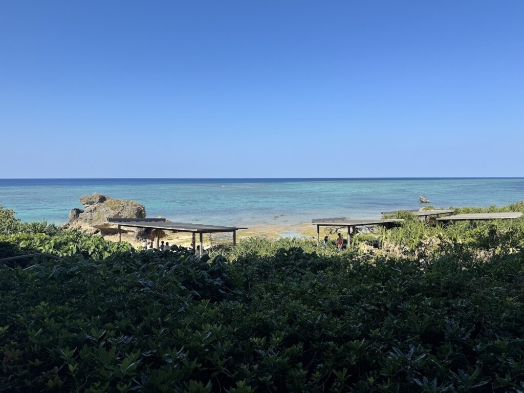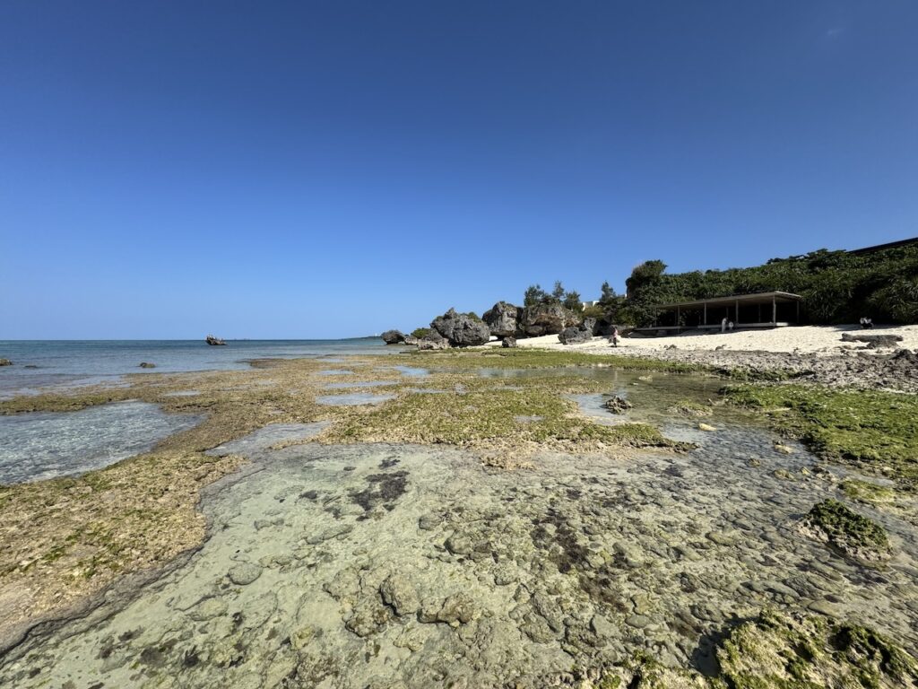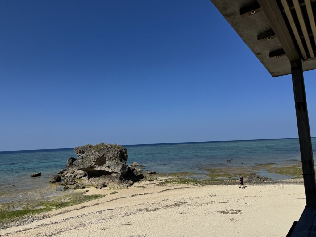 深い庇(ひさし)が作り出す心地よい日陰は、南国の強い日差しを和らげ、吹き抜ける潮風だけを内側へと招き入れてくれます。目の前の展望スペースからは、白砂のビーチと、潮が引いて姿を現したイノー(浅瀬)が手に取るように見渡せました。子どもは海を見るなり、波打ち際へと真っ直ぐに駆け出していきました。サンゴの欠片などで足を怪我しないように、そして波で濡れないようにと、しっかりと靴を履かせたまま見守ります。磯遊びに夢中になり、砂浜にしゃがみ込んでは何かを探している無邪気な姿。その光景を涼しい日陰から眺めていると、思考の断片が波のリズムと同調し、静かに整理されていくのを感じます。