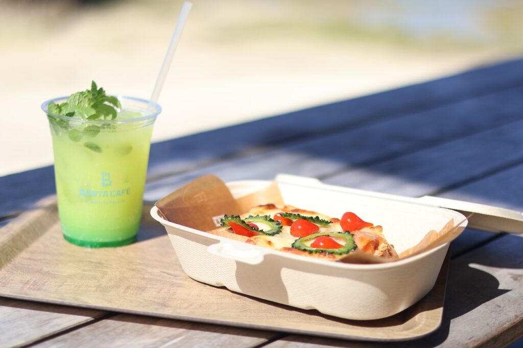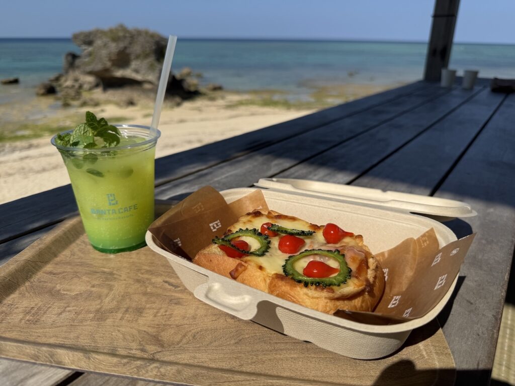 カウンターで受け取った注文の品々をトレイに乗せ、潮風に吹かれながら自分たちの席へと運びます。少し早めの昼食として選んだのは、シグネチャーメニューである「ぽーたまおにぎり」と「ゴーヤピザ」、そして沖縄の太陽を思わせる「シークワーサーサイダー」に、雲のように泡立つ「もこもこサイダー」です。