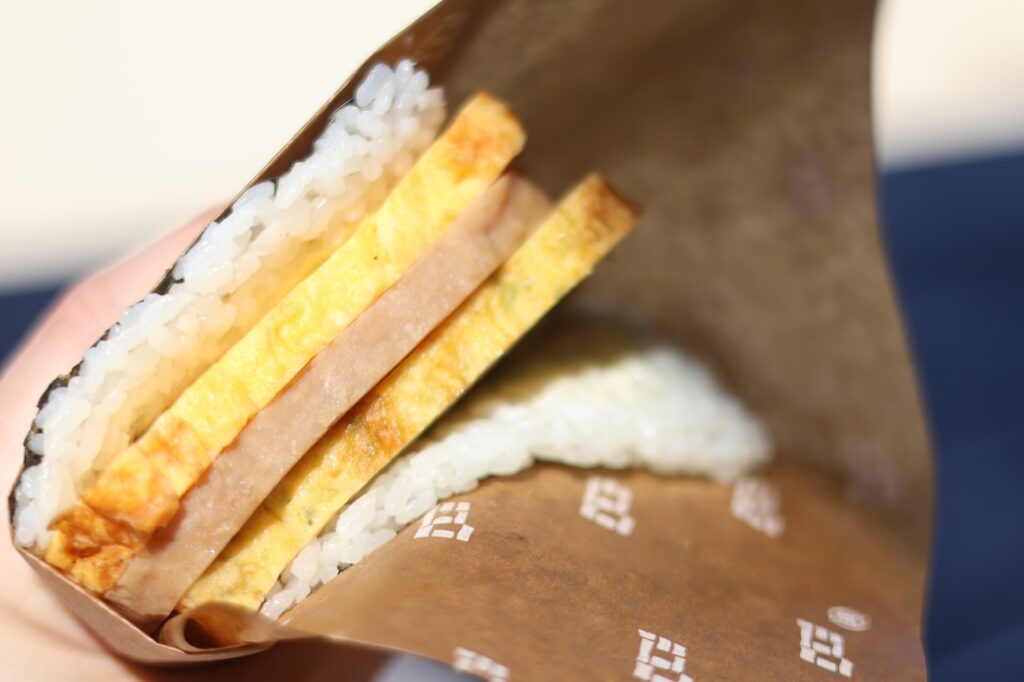 まずは「ぽーたま」を手に取りました。沖縄のソウルフードであるポークランチョンミートと玉子焼きを、ふっくらとしたご飯と海苔で包み込んだ一品。一口かじると、ポークのしっかりとした塩気と脂の旨味が、玉子の優しい甘みと見事なコントラストを描き、口の中でほどよく解けていきます。シンプルだからこそ、素材の温度や食感のバランスがそのまま満足感に直結する、嘘のない味わいです。