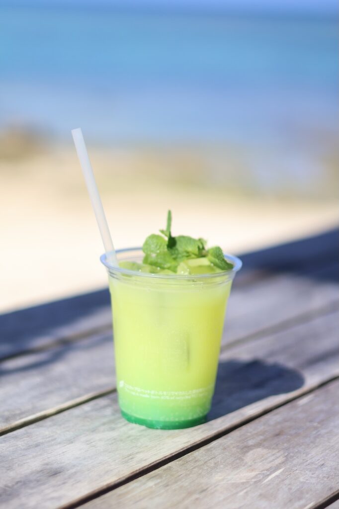 少し塩気を帯びた口の中を、冷たいドリンクが潤します。「もこもこサイダー」は、グラスの上にこんもりと盛られた泡の下に、色とりどりのゼリーがたっぷりと沈んでおり、まるでフルーツポンチのように視覚的にも楽しい一杯です。強めの炭酸とゼリーの心地よい食感が合わさり、ポークの脂をすっきりと洗い流してくれます。一方の「シークワーサーサイダー」は、沖縄固有の柑橘が持つ野性味のある酸味と香りが際立ち、南国の風土を文字通り体内に取り込んでいるかのような清涼感をもたらしてくれました。