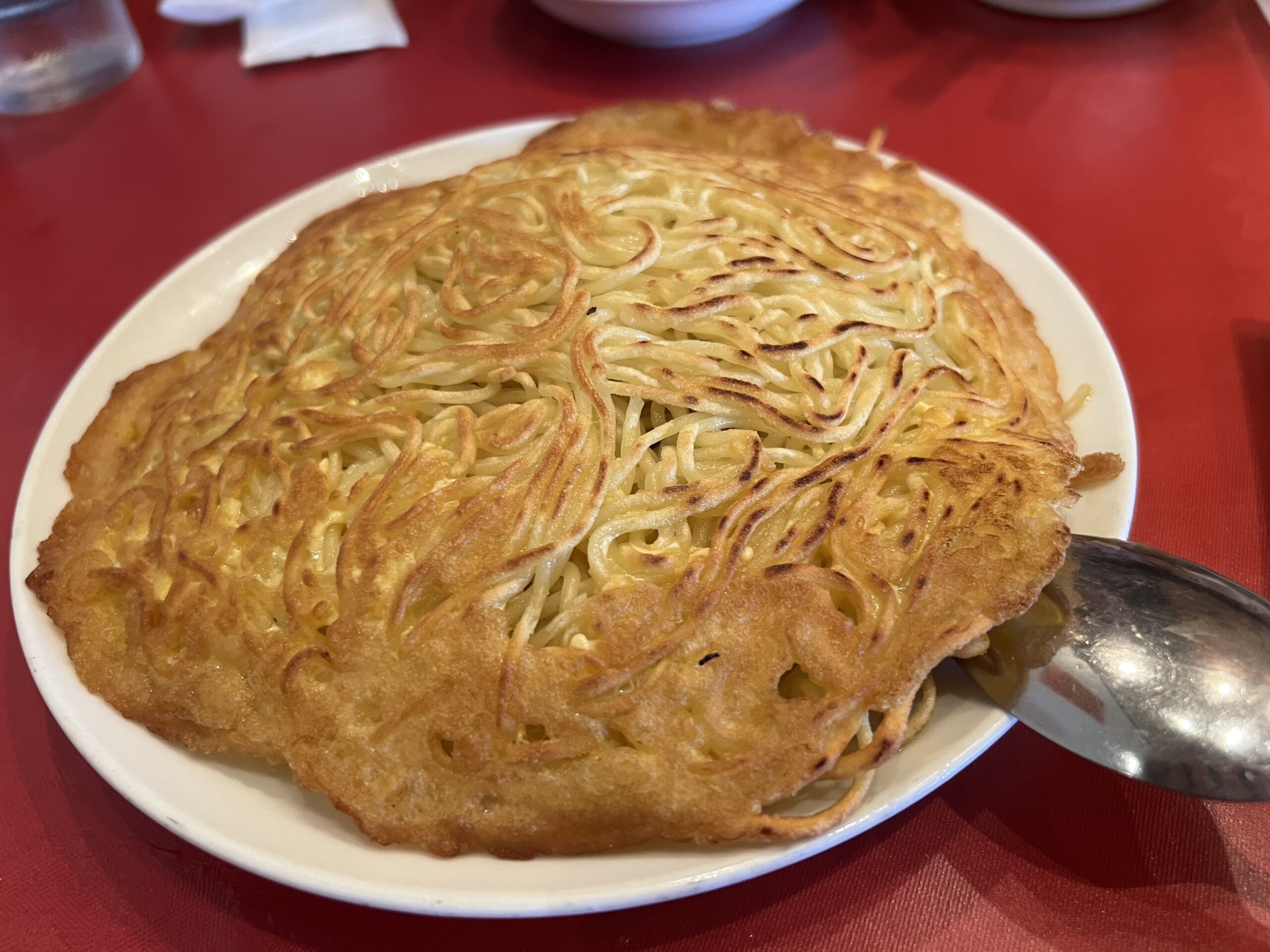 Invented 20 years ago, “Bairan Yakisoba” is a crispy fried noodle with a filling of pork, bean sprouts, onions, and other ingredients hidden under the fried noodle.