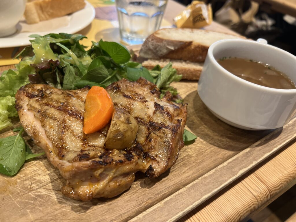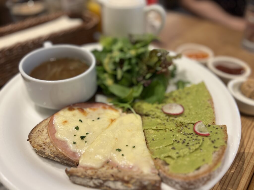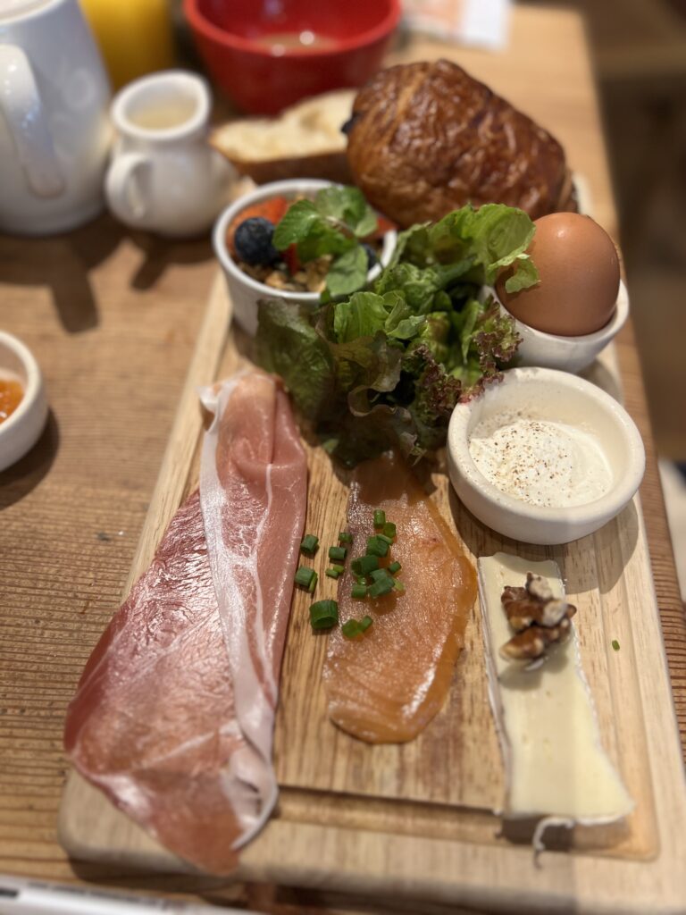 サーフ&ターフのブランチは、パンオショコラからミューズリ、スモークサーモンから半熟たまごまで、少しずつ色々な食材が楽しめます。赤いカフェオレボウルが可愛い。Pain Quotidienのシグネチャー的なタルティーヌ・プレートは、人気のアボカドとクロックムッシュが両方味わえます。本日のグリル・プレートはチキンでしたが、皮はパリッと、中はジュ―シーで、コスパのよい一品でした。添えられたパンは、セルフサービスで選べるジャム(いちじく、ブルーベリー、ストロベリー、マーマレード等)やナッツペーストで、さまざまな味が楽しめます。