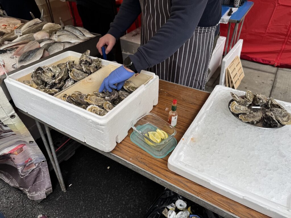 ロンドンの路上で、しかもこの寒空の下で生牡蠣を食べる。その背徳感と贅沢さに惹かれて、迷わず足を止めました。